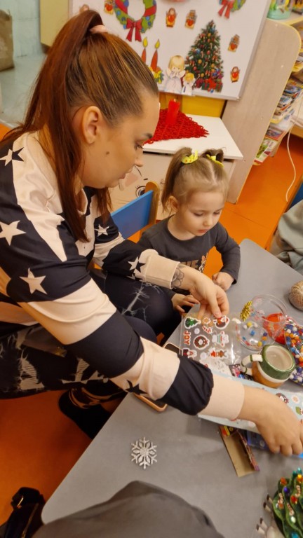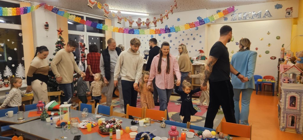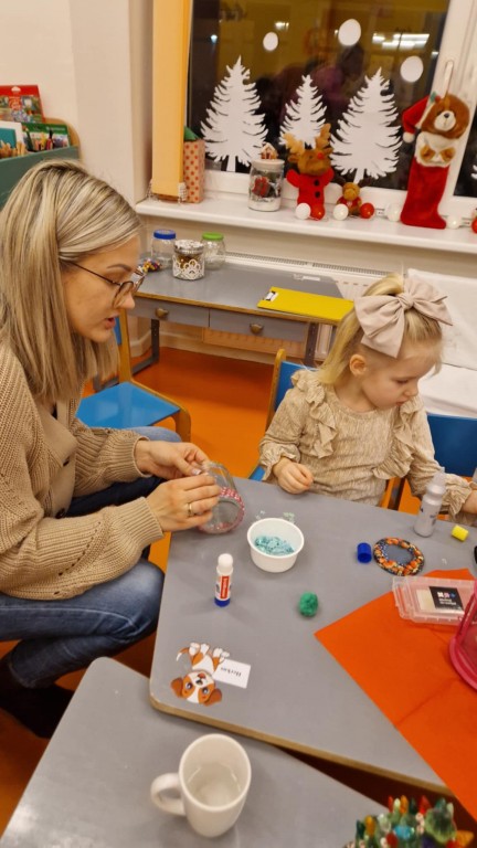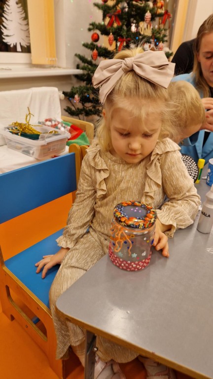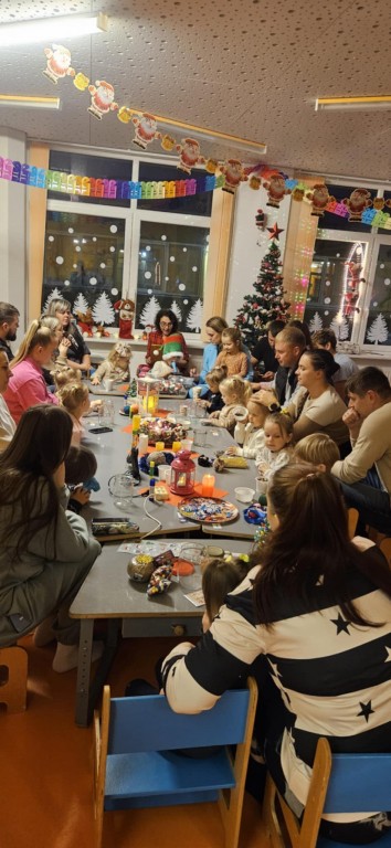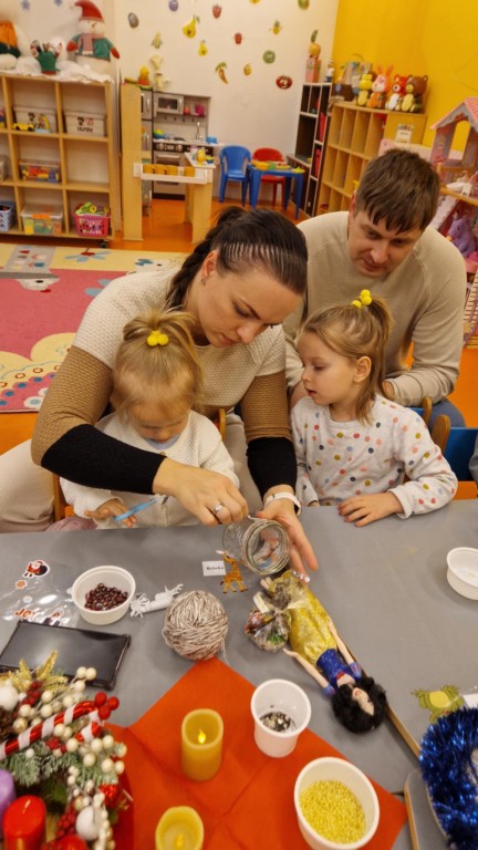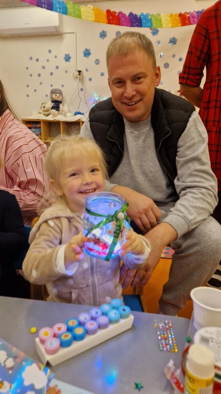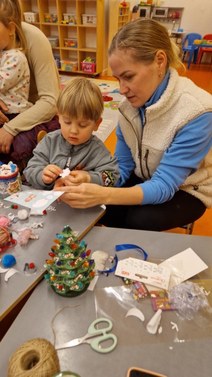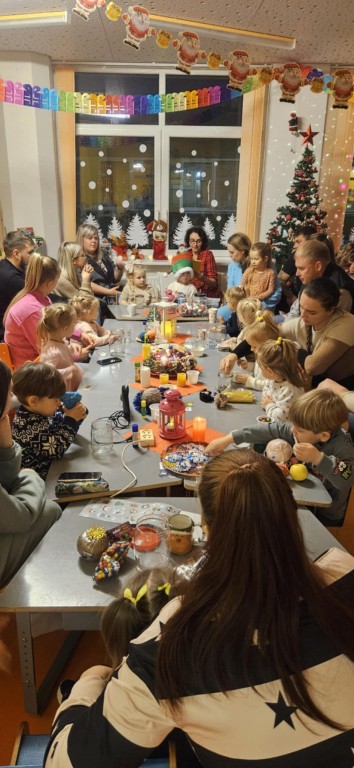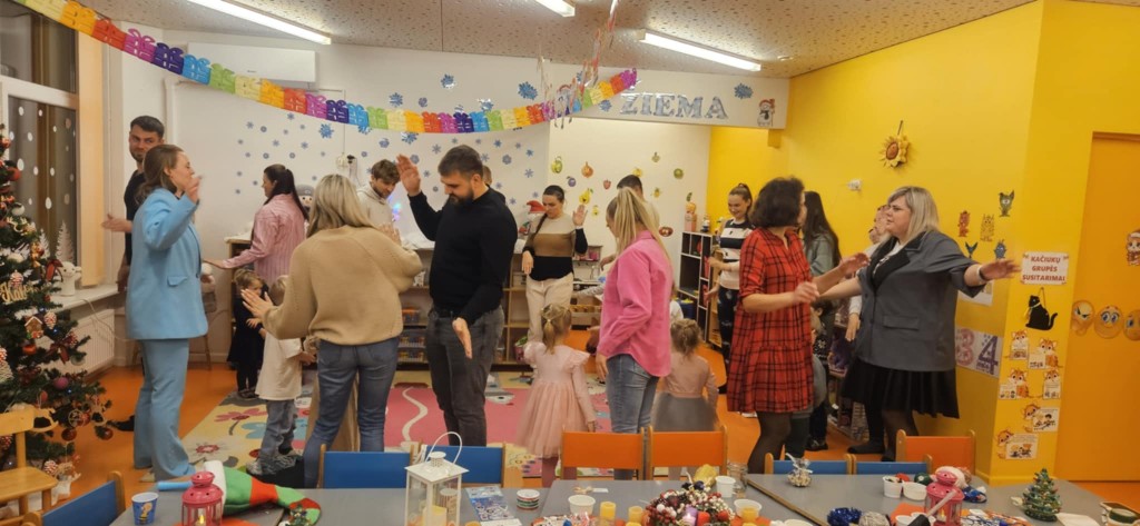 Artėjant gražiausioms metų šventėms „Kačiukų“ grupėje vyko jaukus ir kūrybiškas tėvelių susibūrimas Kalėdinių žibintų gamybos pavakarys. Renginys prasidėjo linksmai, kuriame tėveliai kartu su vaikais įsitraukė į šokį ir trumpą mankštelę. Judesys, muzika ir juokas padėjo atsipalaiduoti, suartino visus dalyvius ir nuteikė bendram darbui ir tapo puikia įžanga kūrybinei veiklai. Kūrybinėje dalyje tėveliai ir vaikai dirbo kartu: lipdė, klijavo, puošė ir dalijosi idėjomis, kad kuo gražesnis taptų Kalėdinis žibintas. Vaikams buvo ypač smagu matyti, kaip jų sumanymai tampa tikrais kalėdiniais žibintais, o tėveliams – džiaugtis bendru laiku ir vaikų kūrybiškumu. Kūrybos akimirkos suteikė vaikams pasitikėjimo savimi, skatino jų vaizduotę bei leido patirti, kaip svarbu bei smagu veikti drauge su tėveliais. Pagaminti žibintai tapo ne tik šventine puošmena, bet ir šilto, bendruomeniško susibūrimo simboliu, primenančiu, kad Kalėdų laukimas, tai dalijimasis, bendravimas ir buvimas kartu. Šis renginys tapo puikia galimybe pabūti visiems kartu, sustiprinti tarpusavio ryšius ir kurti jaukią, šventinę nuotaiką. Džiaugiamės aktyviu tėvelių dalyvavimu, nuoširdžiu bendravimu ir noru kartu su vaikais kurti prasmingas patirtis. Tokie susibūrimai stiprina bendruomeniškumą, kuria pasitikėjimu grįstą ryšį tarp šeimos ir ugdymo įstaigos bei palieka gražius prisiminimus tiek vaikams, tiek suaugusiesiems