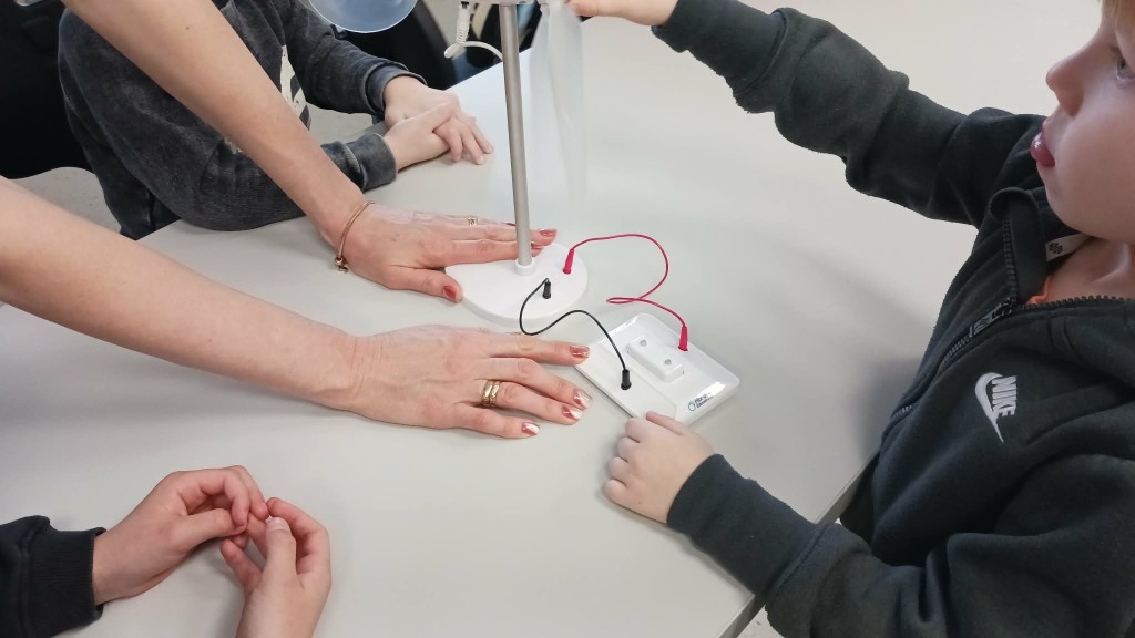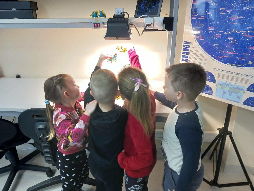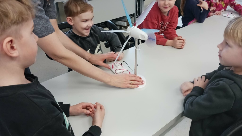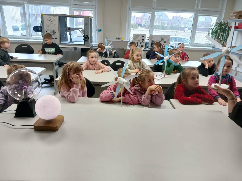 Pirmiausia, vaikai buvo supažindinti su tvariomis elektros gaminimo galimybėmis. Mažieji sužinojo, kad elektra gali būti išgaunama ne tik įprastais būdais, bet ir pasitelkiant gamtos išteklius: saulę, vėją bei vandenį. Edukatorė paprastai vaikams suprantamai paaiškino, kaip šie natūralūs energijos šaltiniai gali būti panaudojami kasdieniame gyvenime, kodėl svarbu saugoti gamtą ir rinktis aplinkai draugiškus sprendimus. Didžiulį susidomėjimą sukėlė praktiniai bandymai. Buvo be galo įdomu patiems išbandyti, kaip išgaunama elektra iš saulės, vėjo ir vandens. Smalsios akys sekė kiekvieną žingsnį, o rankos mėgino naujus dalykus. Ne mažiau įspūdžių paliko ir eksperimentas, kurio metu cukraus pudra virto anglimi. Šis netikėtas ir akį traukiantis virsmas sukėlė tikrą nuostabos bangą. Vaikai iš pradžių net sulaikė kvapą stebėdami vykstantį procesą, o netrukus nustebo ir dėl pasklidusio ne itin malonaus kvapo. Visa tai tik dar labiau sustiprino patirtį ir pavertė ją nepamirštama. Mažieji smalsuoliai stebėjo, kaip iš, atrodytų, paprastos ir visiems gerai pažįstamos cukraus pudros vyksta visiškai netikėtas pokytis. Jų akyse atsispindėjo nuostaba, o galvose kilo daugybė klausimų: kaip tai įmanoma? kodėl cukrus keičia savo pavidalą? kas vyksta eksperimento metu? Vaikai aktyviai diskutavo tarpusavyje, dalijosi savo spėjimais ir bandė rasti atsakymus.