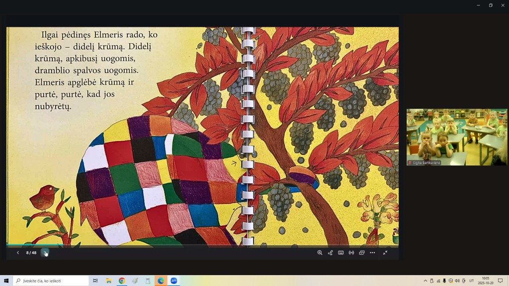 Ugdytiniai turėjo galimybę susipažinti su drambliais, jų rūšimis, gyvenimo įpročiais, straublio paslaptimis ir ausų funkcijomis. Vaikai aktyviai klausėsi pasakojimo apie ypatingą dramblį Elmerį – spalvotą, išskirtinį herojų, kuris moko drąsos būti savimi, išsiskirti iš minios ir priimti kitokį. Po pažintinės dalies vaikai atliko kūrybinę užduotį, kurios metu, pasitelkę spalvas, kūrė savo drambliukus, įkvėptus Elmerio istorijos. Tai buvo puiki proga ne tik ugdyti pažintinius ir meninius gebėjimus, bet ir kalbėti apie draugystę, toleranciją ir savęs priėmimą. Džiaugiamės, kad mūsų ugdytiniai galėjo dalyvauti šioje turiningoje veikloje ir praplėsti savo žinias apie gyvūnų pasaulį bei svarbias gyvenimo vertybes. Dėkojame Šiaulių techninės kūrybos centrui už kvietimą ir puikią edukaciją.