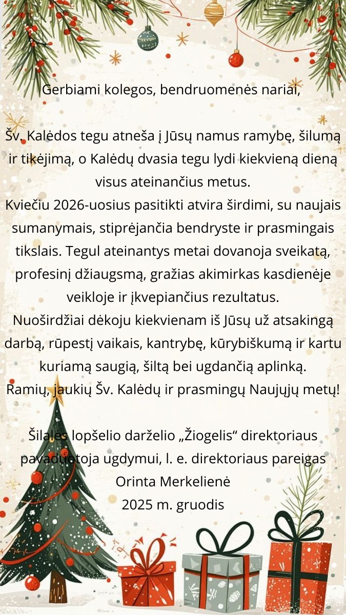 Šventinis laikotarpis Šilalės lopšelyje – darželyje „Žiogelis“ turi ypatingą galią. Jis sujungia vaikus, mokytojus, skatina bendrystę ir dovanoja daug šilumos. Šiemet „Kiškučių“ ir „Kačiukų“ grupės nusprendė pradėti Kalėdų laukimą neįprastai: surengti bendrą kelionę į Kalėdas per muziką, šokį ir žaismingą judesį. Šis susibūrimas tapo gražiu draugystės tiltu tarp dviejų grupių ir tikra šventine pramoga mažiesiems. Susibūrimo metu vaikai draugiškai sujungė savo kūrybines jėgas: „Kiškučiai“ smagiai šokinėjo, lingavo ir kvietė visus draugus į ratelį, o „Kačiukai“ savo grakščiais judesiais ir muzikiniu ritmu sukūrė jaukią, šventišką nuotaiką. Mažieji kartu dainavo kalėdines daineles, atliko linksmus šokius ir ritminius žaidimus, kurie tarsi iš mažų lašelių lipdė didelį Kalėdų laukimo jausmą. Susitikimą praturtino ir įvairūs ritminiai bei judesių žaidimai. Vaikai sekė rodomus veiksmus: bėgo kaip kiškučiai, tyliai tipeno kaip kačiukai, sniego gniūžčių kritimą mėgdžiojo rankų judesiais, sukosi tarsi snaigės.