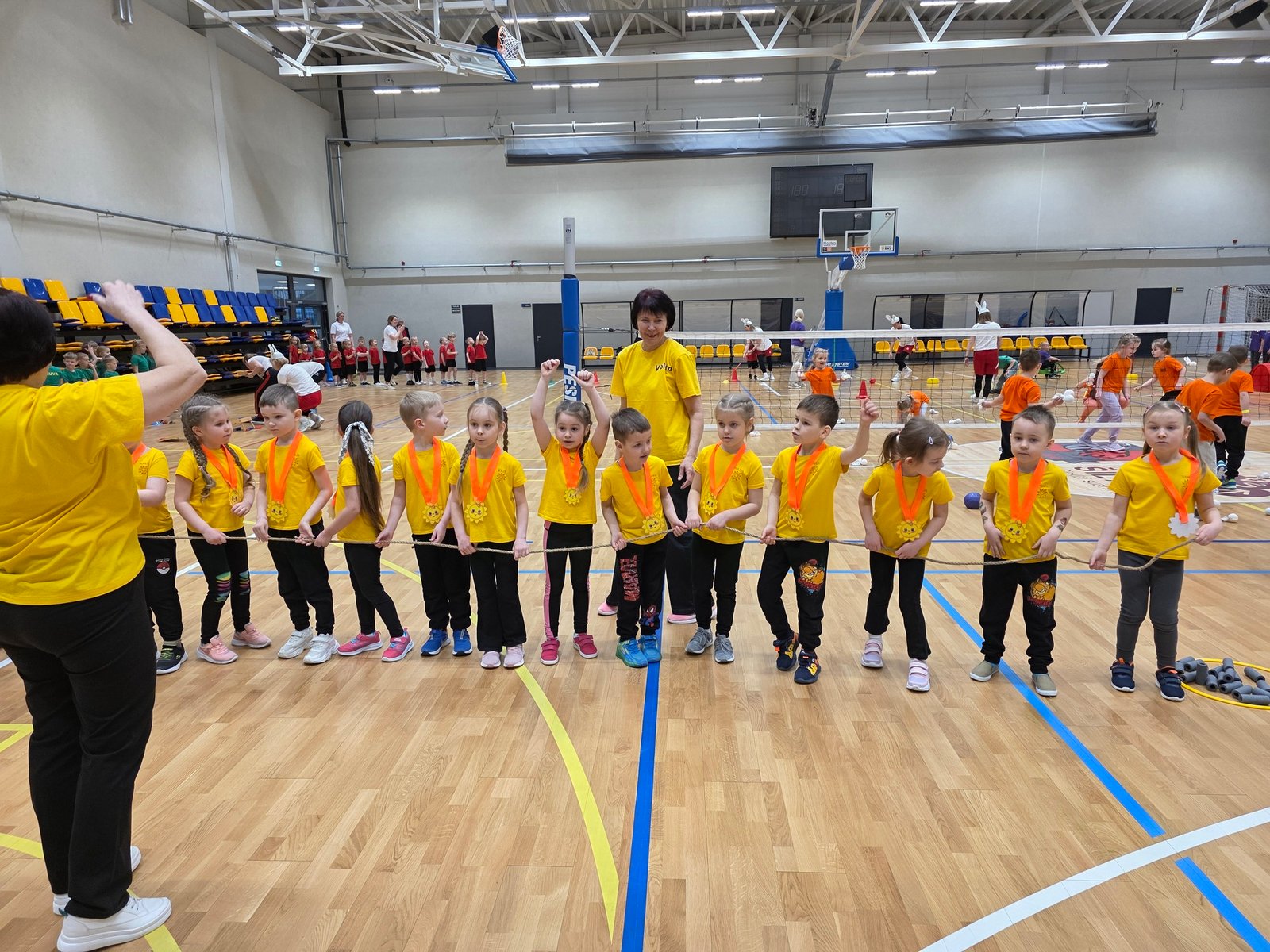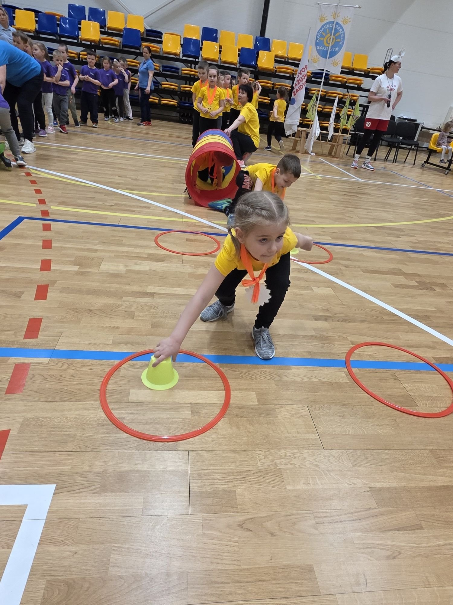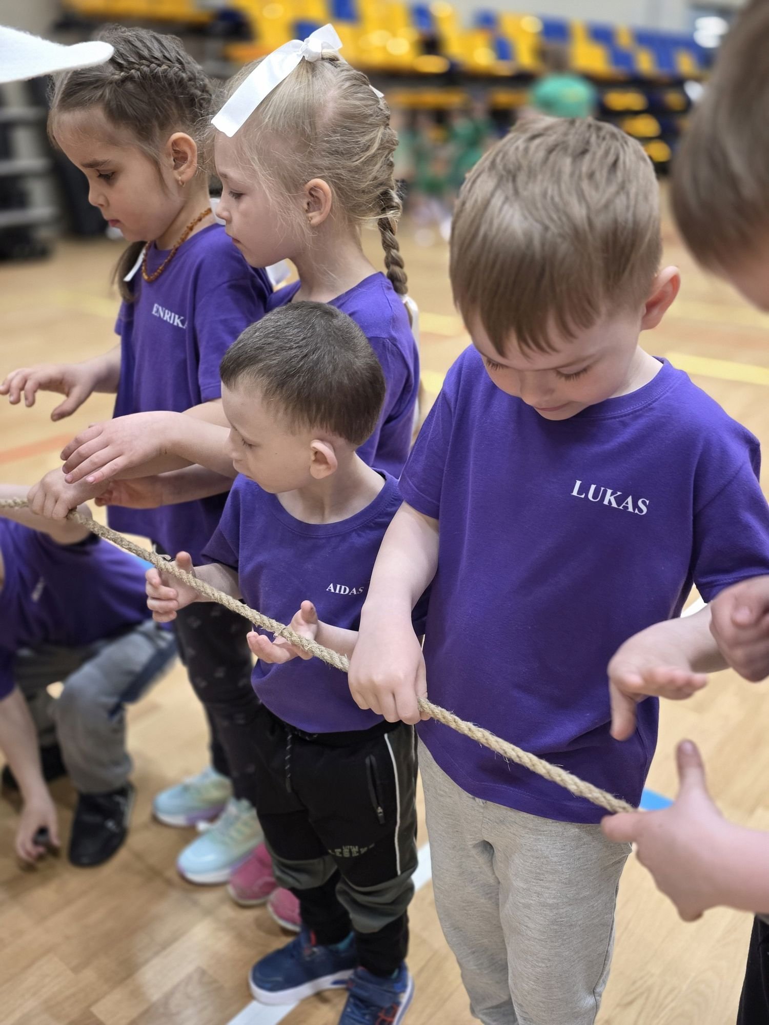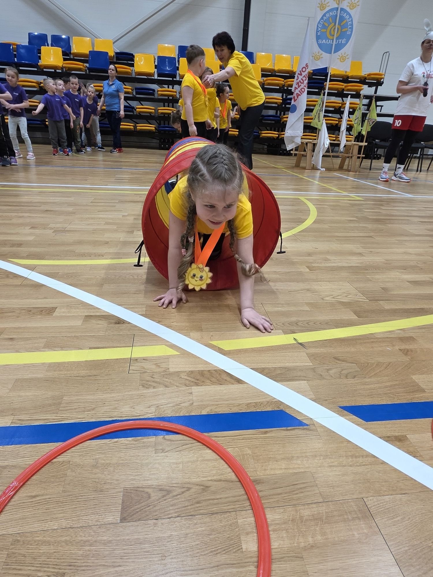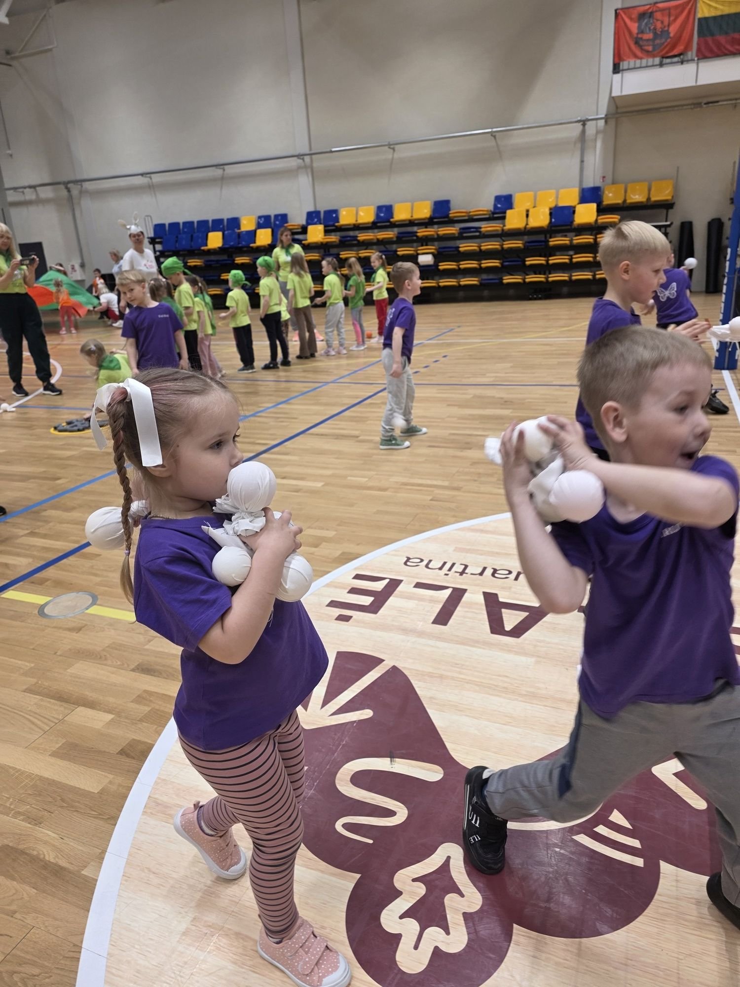 Po mankštos ugdytiniai dalyvavo net devyniose skirtingose sportinėse rungtyse. Užduotys buvo žaismingos, įdomios ir įvairios: vaikai piešė, mėtė minkštus kamuoliukus per tinklą, važiavo su riedžiais, vėrė ant virvės kartoninius ritinėlius, mušė kamuolį į vartus porolonine lazda, žaidė su spalvotu parašiutu, lindo tuneliu, dėliojo figūrėles ir atliko kitas aktyvias užduotis.