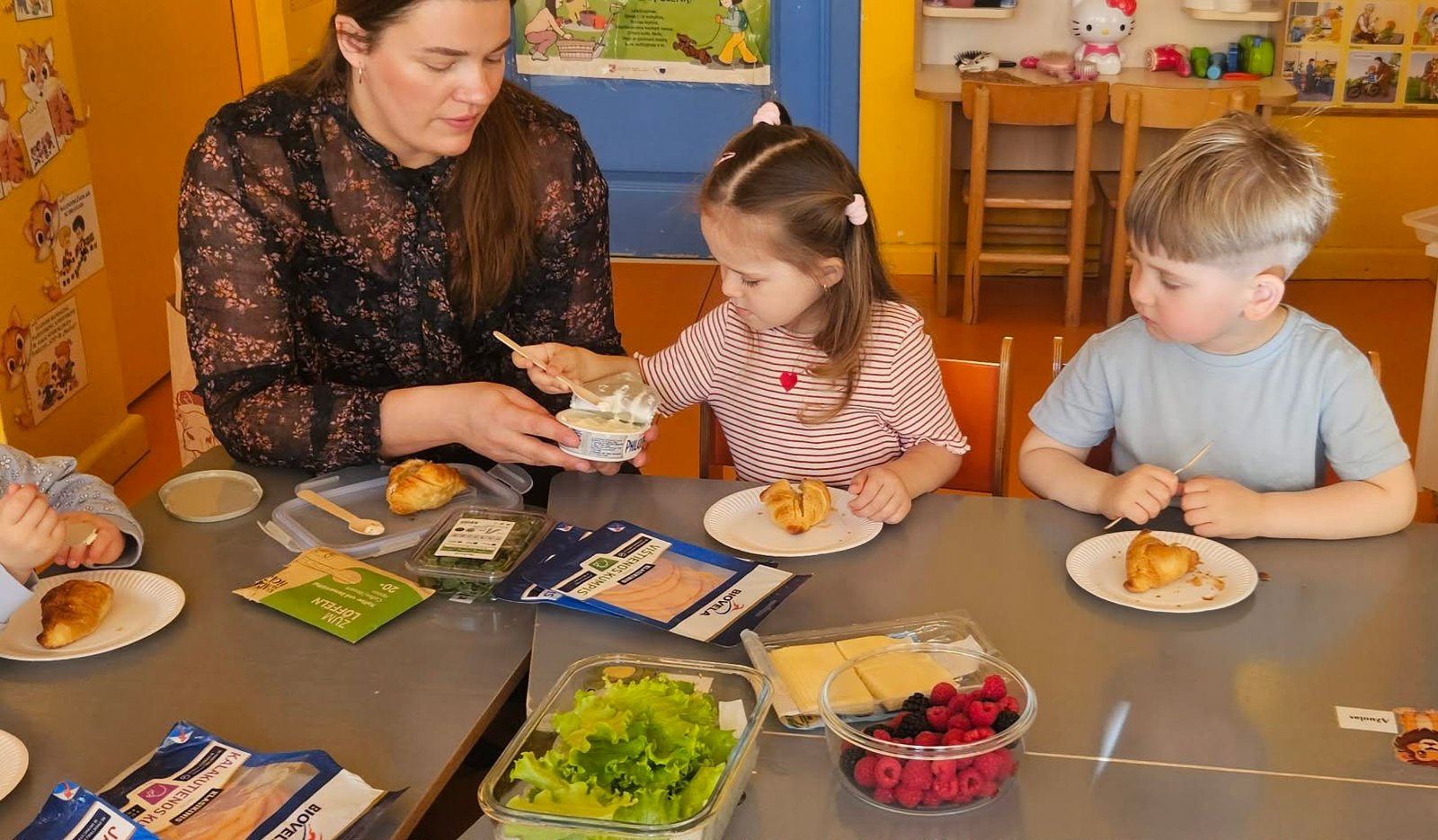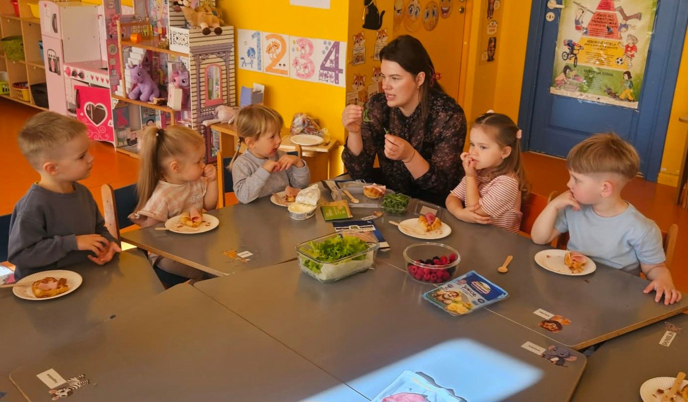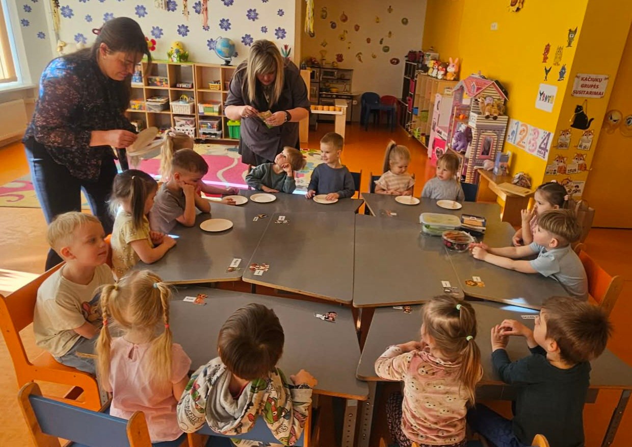 2026 m. balandžio 13 dieną Šilalės lopšelyje-darželyje „Žiogelis“, „Kačiukų“ grupėje vyko jaukus, žaismingas ir įtraukiantis edukacinis rytmetis „Kačiukų virtuvėlė – sveikuoliški užkandžiai“. Ši veikla organizuota bendradarbiaujant su ugdytinės Marijos mama Justina, siekiant stiprinti šeimos ir ugdymo įstaigos partnerystę bei skatinti vaikų sveikos mitybos įpročius per patirtinį ugdymą. Edukacinio rytmečio metu vaikai buvo kviečiami aktyviai dalyvauti paprasto sveiko užkandžio gaminimo procese. Mažieji „Kačiukų“ grupės ugdytiniai kartu su mokytojomis ir viešnia susipažino su įvairiais sveikais maisto produktais: uogomis, daržovėmis ir kitais naudingais ingredientais. Vaikai juos tyrinėjo visais pojūčiais – lietė, uostė, ragavo, mokėsi atpažinti skonius, spalvas bei pavadinimus. Mažosios rankytės su dideliu susidomėjimu ėmėsi darbo, dėliojo produktus, rinkosi mėgstamiausius ingredientus ir kūrė spalvingus, sveikuoliškus užkandžių derinius. Vaikai formavo kompozicijas, mokėsi derinti spalvas bei skonius. Kiekvienas ugdytinis stengėsi sukurti kuo gražesnį ir skanesnį savo užkandį, o kūrybos procese netrūko džiaugsmo, smalsumo ir pasididžiavimo savo darbu. Veiklos pabaigoje vaikai džiaugėsi savo sukurtais sveikuoliškais užkandžiais, juos ragavo, dalijosi įspūdžiais ir aptarė, kas labiausiai patiko, taip įtvirtindami žinias apie sveiką mitybą bei patirdami daug gerų emocijų.
