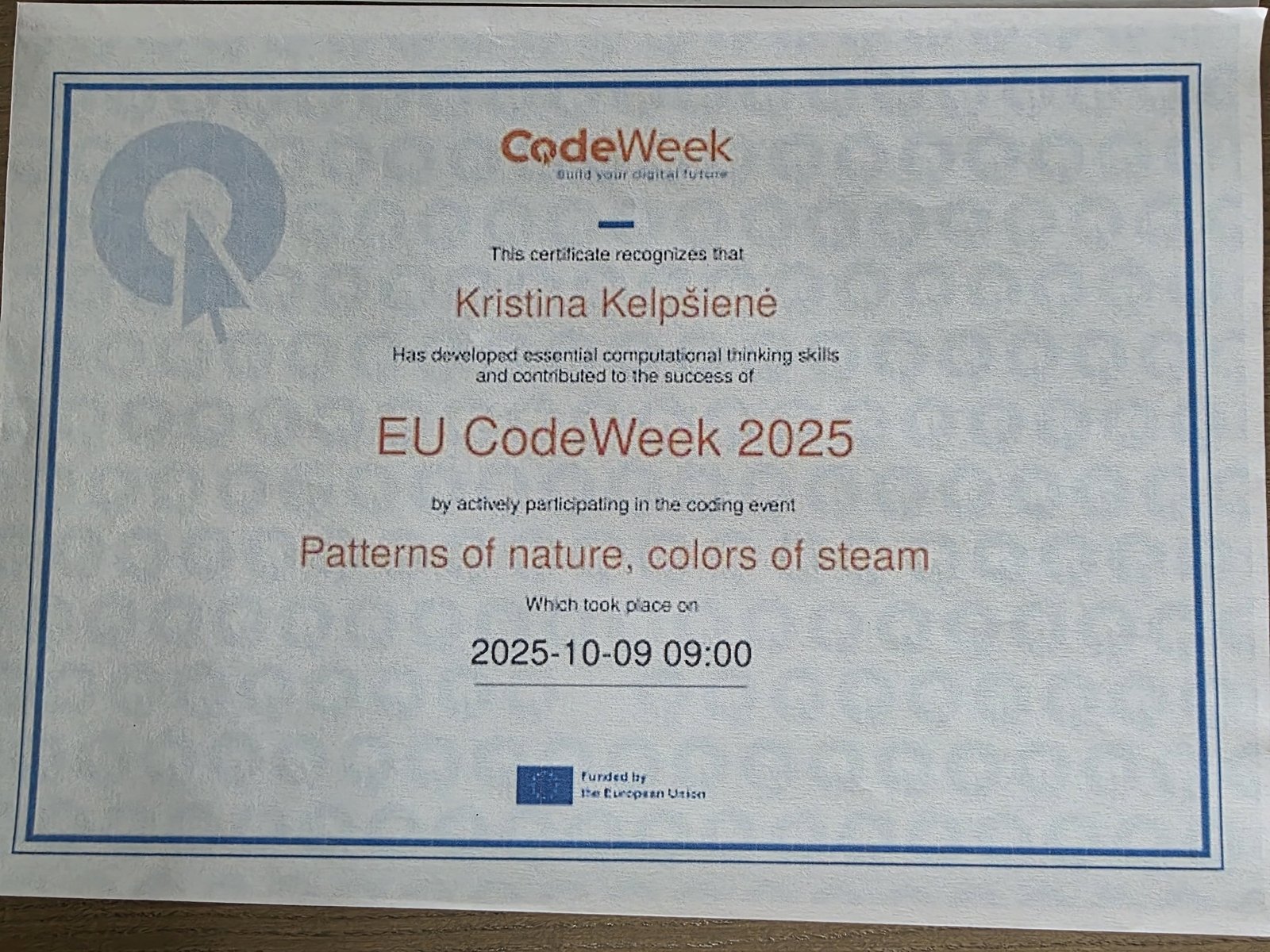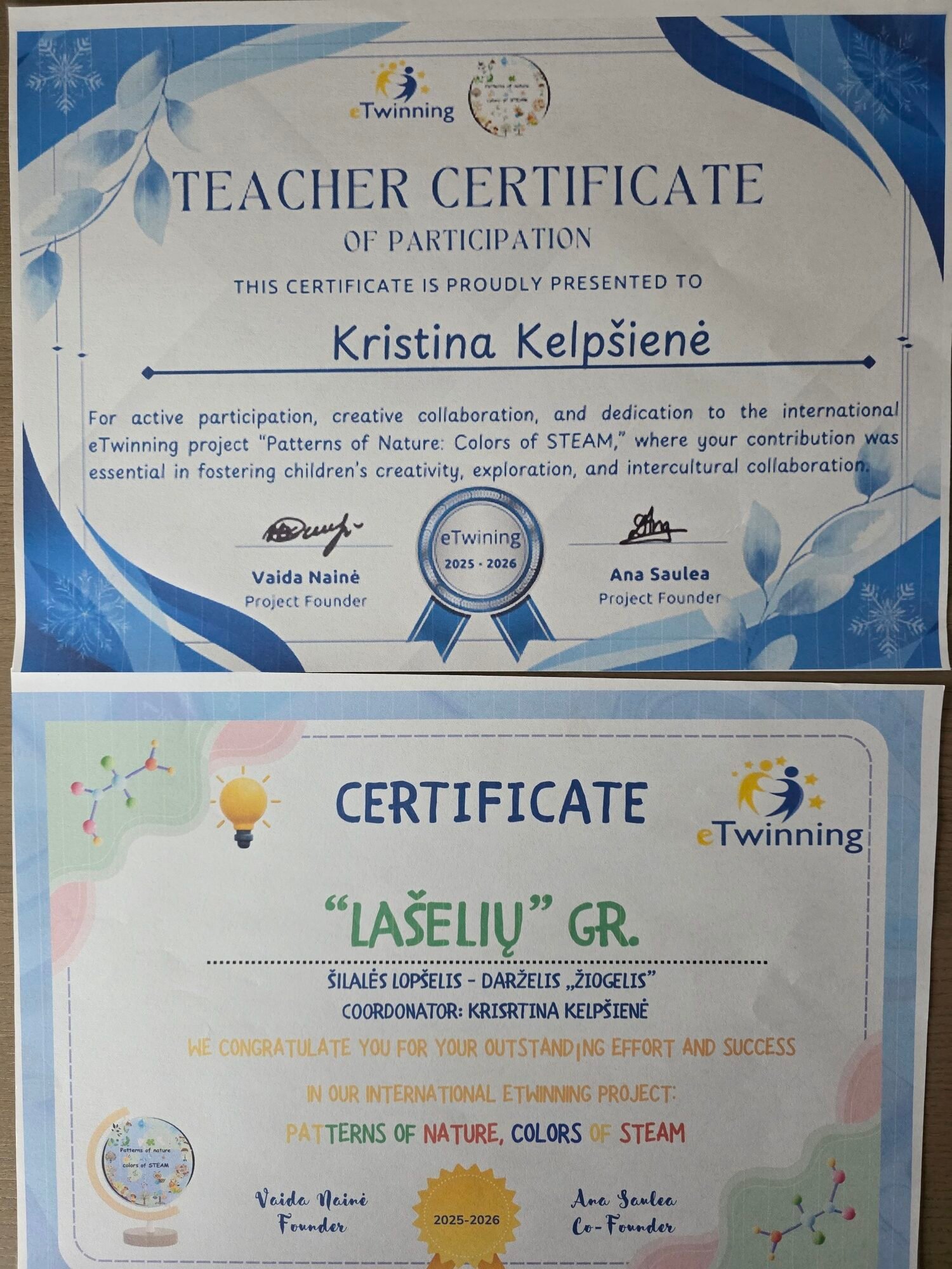 Nuo 2025 m. rugsėjo iki 2026 m. kovo mėn. ,,Lašelių“ grupės vaikai su ikimokyklinio ugdymo mokytoja Kristina Kelpšiene dalyvavo tarptautiniame eTwinning projekte „Patterns of Nature, Colors of STEAM“, kuriame bendradarbiavo 25 mokytojai iš Turkijos, Rumunijos, Kroatijos, Graikijos, Bulgarijos, Šiaurės Makedonijos, Ukrainos ir Lietuvos.