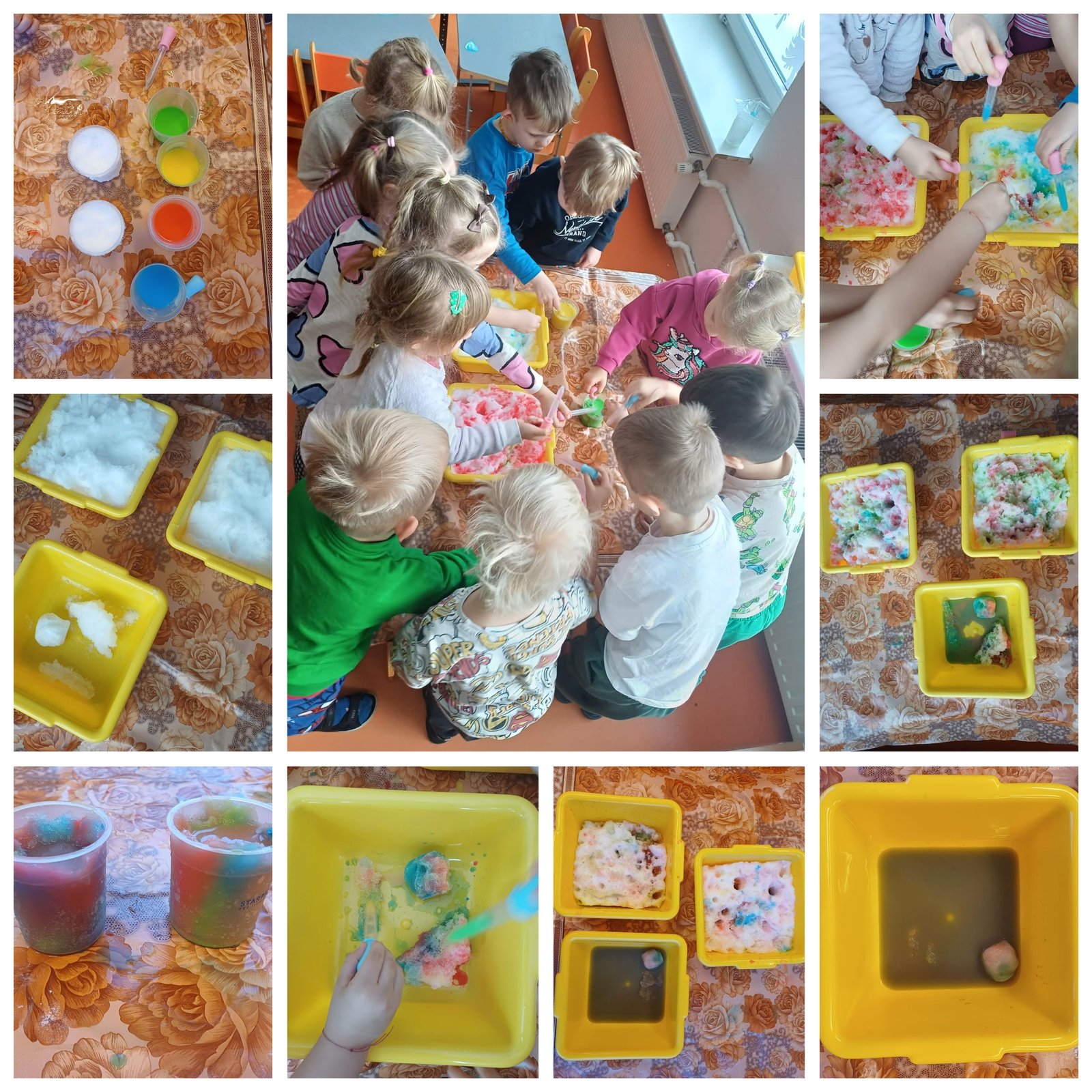 - vasario mėnesį kūrėme spalvotą Lietuvos gimtadienio „tortą“ iš ledo ir druskos. Vaikai stebėjo, kaip vanduo virsta ledu, kaip jis tirpsta, lygino rezultatus ir darė išvadas – ledas su druska tirpo greičiau. Taip pat tyrinėjome sniegą – vaikai jį lietė, dažė, stebėjo tirpimą, spalvų susiliejimą;