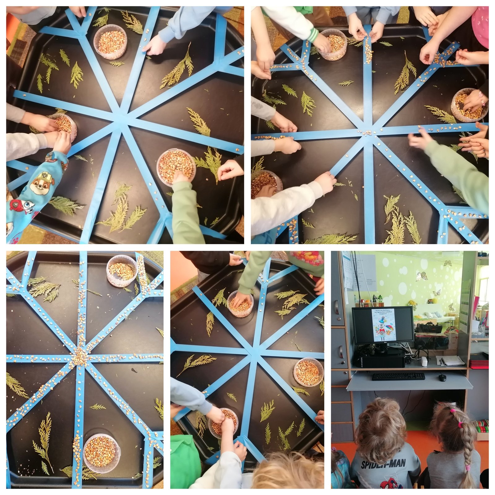 - sausio mėnesį tyrinėjome snaiges, jų formas, dydžius, unikalumą. Vaikai kūrė snaiges iš įvairių detalių, skaičiavo jų elementus. Projekto dalyviai bendradarbiaudami kūrė bendrą snaigės plakatą „Canva“ programoje. Iš visų sukurtų snaigių buvo suformuota viena bendra snaigė, iš kurios sukurtas vaizdo įrašas;