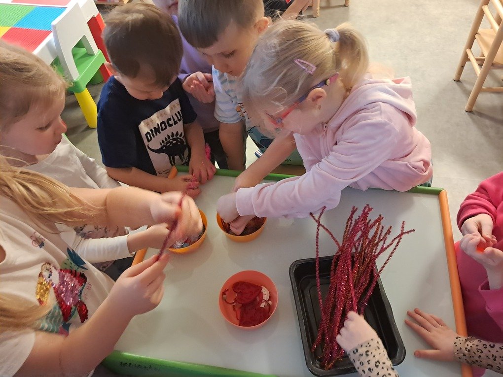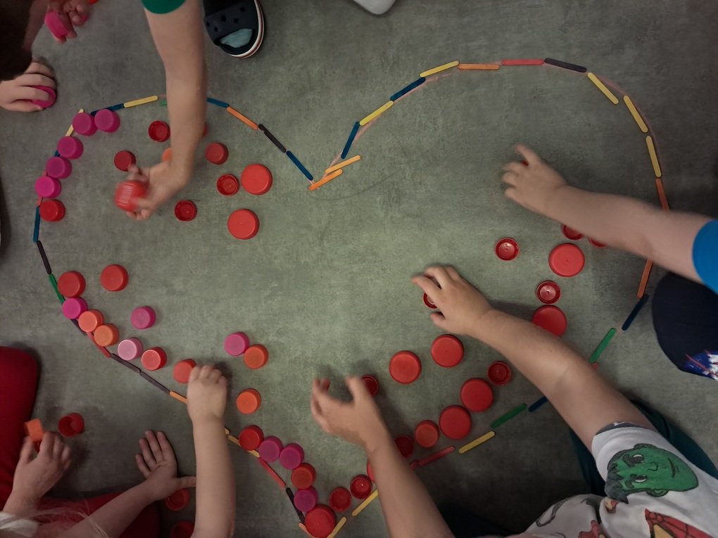 – iš spalvotų pagaliukų ir plastikinių kamštelių kūrė meilės kupiną širdelę;