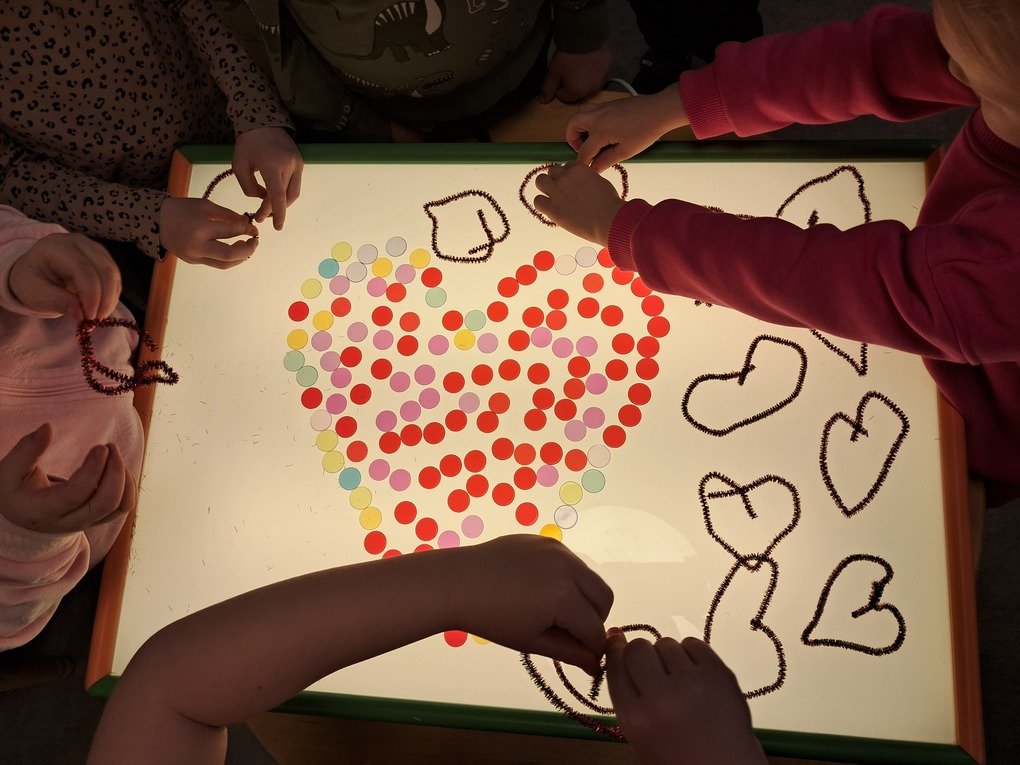 – iš spalvotų rutuliukų ir šenilo vielučių ant šviesos stalo kūrė „Šviečiantį meilės paveikslą“.