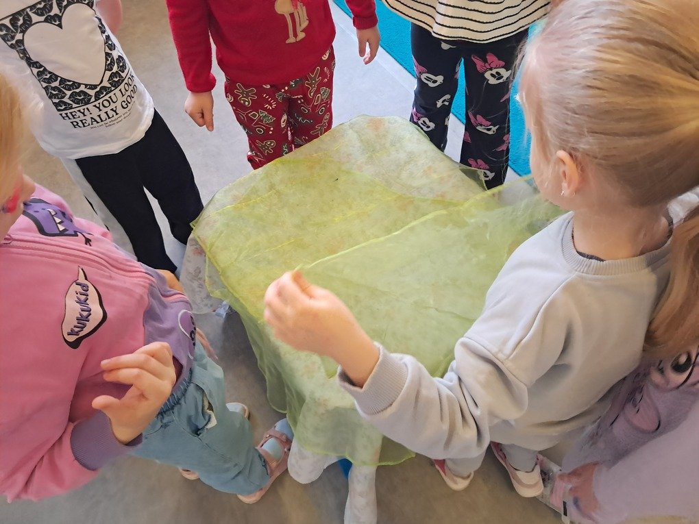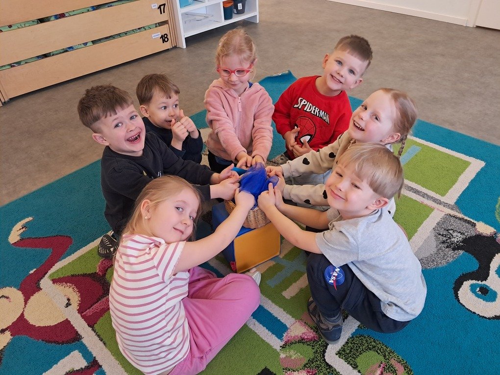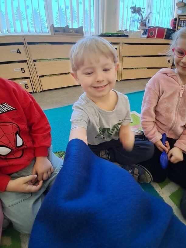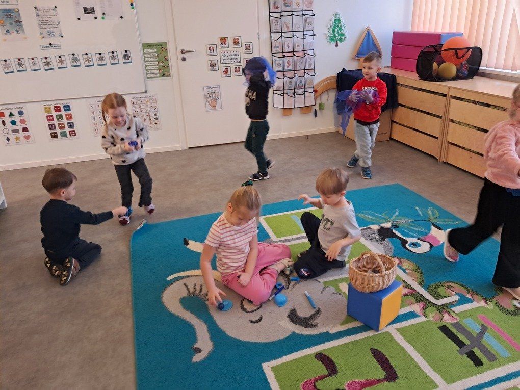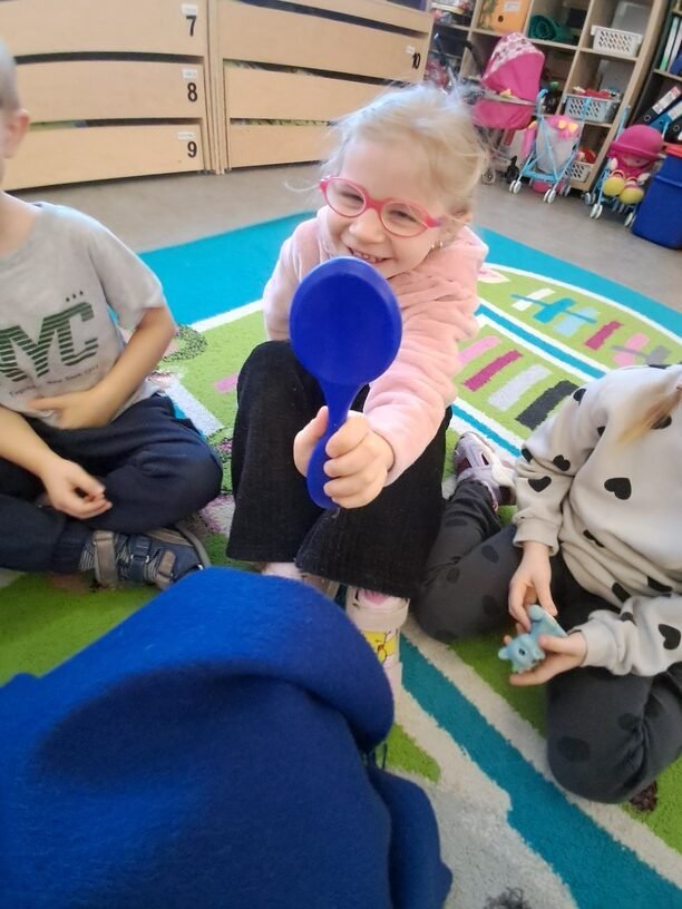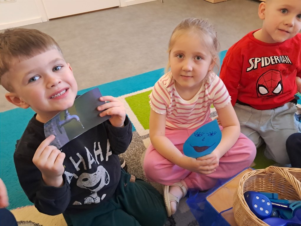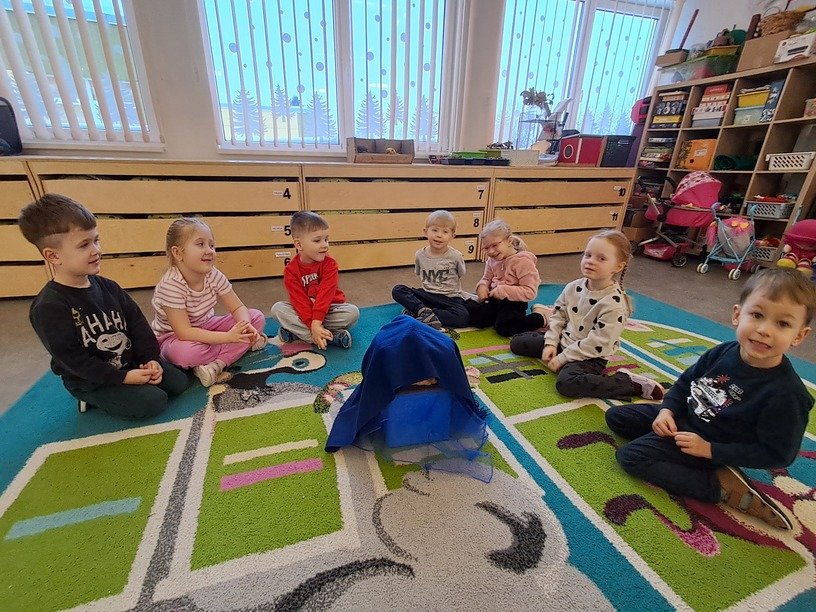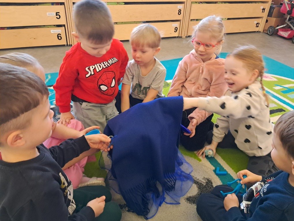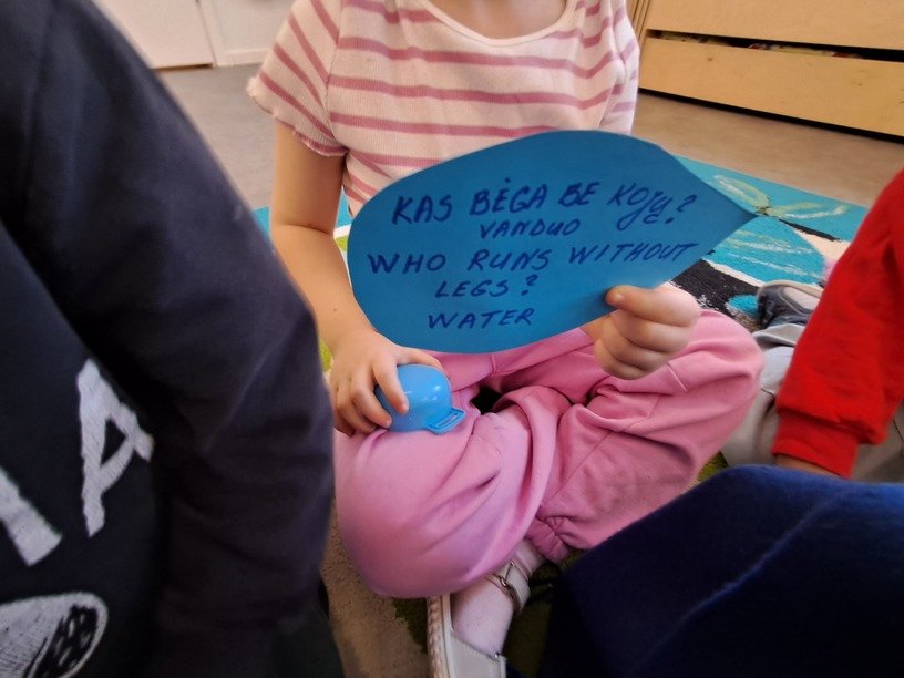 – žaidė žaidimą „Kas slepiasi po mėlynu gobtuvu?“. Ugdytiniai iš krepšelio traukė po vieną paslėptą mėlynos spalvos daiktą, tyrinėjo bei įvardijo juos. Krepšelyje buvo „pasislėpęs“ mėlynas vandens lašelis ant kurio lietuvių ir anglų kalbomis buvo užrašyta mįslė. Ją vaikučiai turėjo įminti. Visi svarstė ne tik koks atsakymas užkoduotas šioje mįslėje, bet ir kodėl visi „pasislėpę“ daiktai yra mėlynos spalvos;