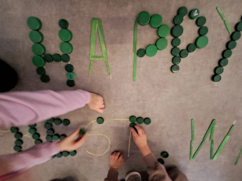 – iš įvairių dydžių žalios spalvos medinių pagaliukų ir kamštelių kūrė virtualų sveikinimą anglų kalba bei susipažino su keletu angliškų žodžių.