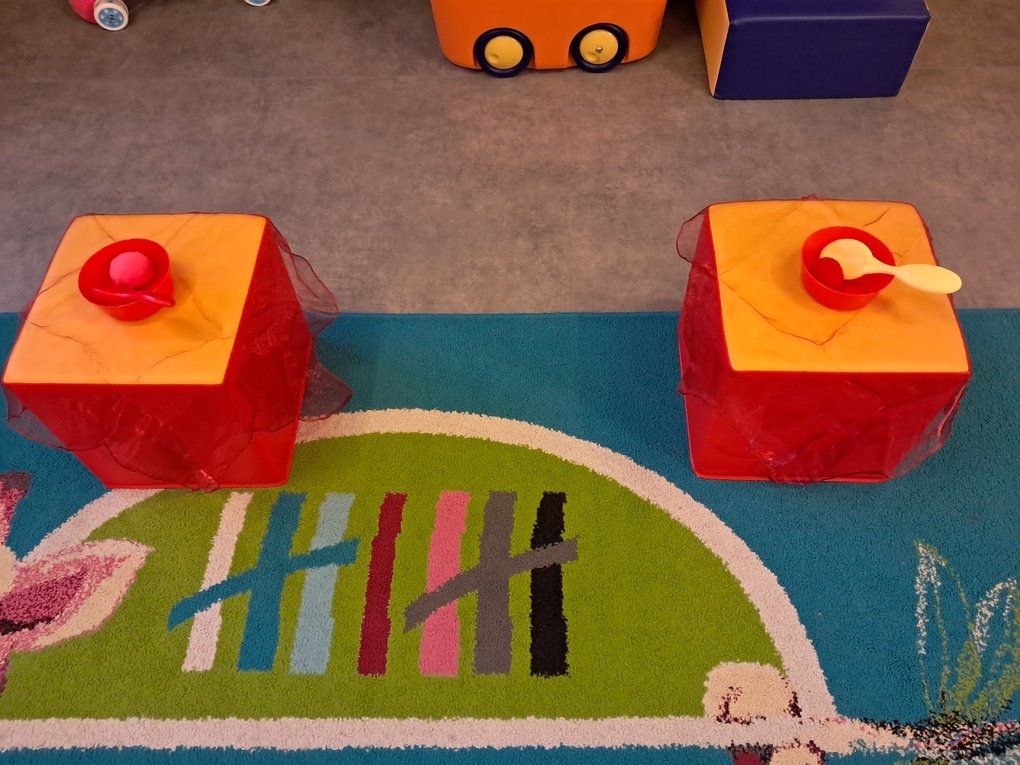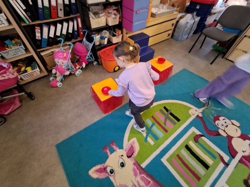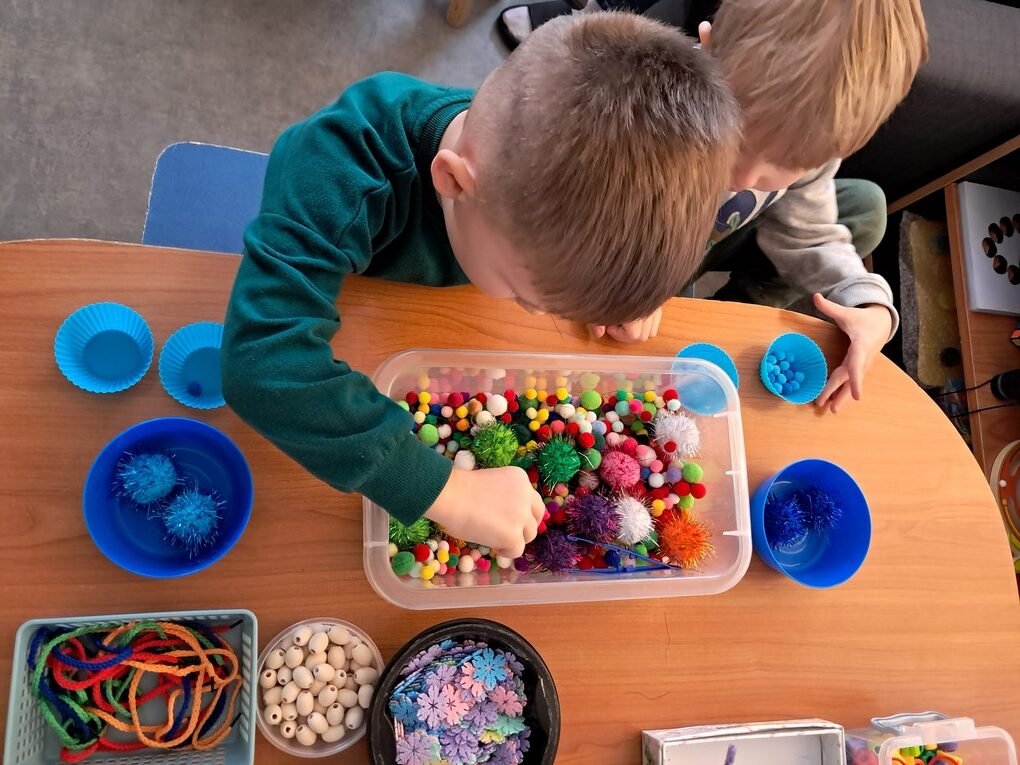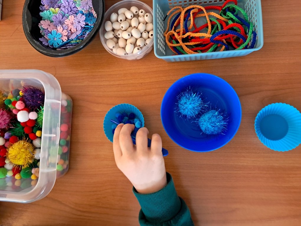 – atsipalaidavimo, sensorinio užsiėmimo metu tarp įvairių dydžių minkštų spalvotų rutuliukų pincetu ieškojo mėlynos spalvos rutuliukų, juos rūšiavo;