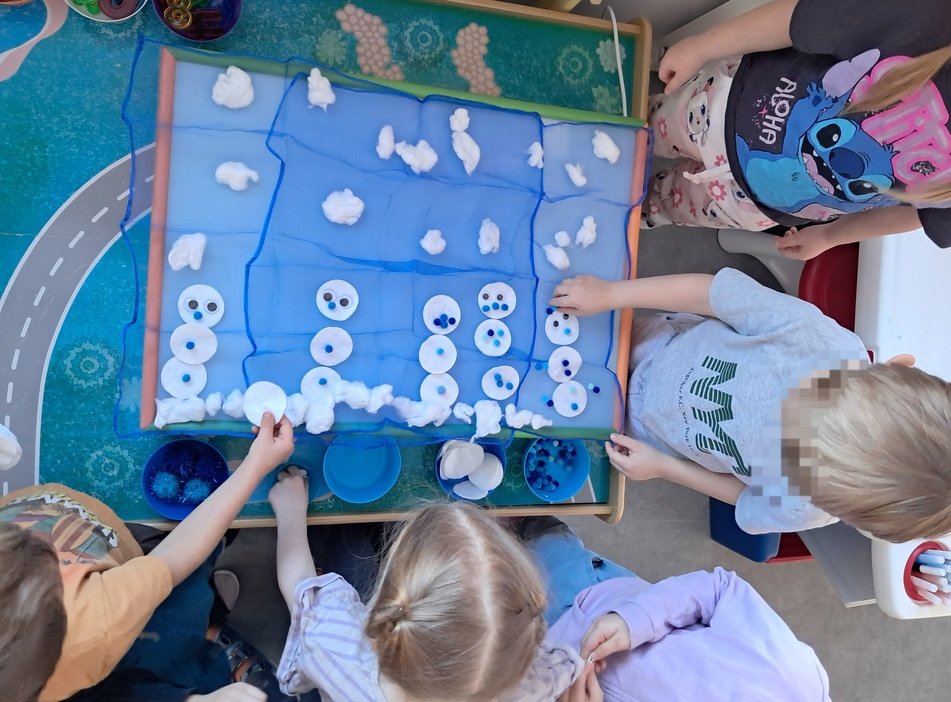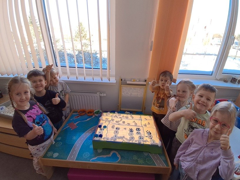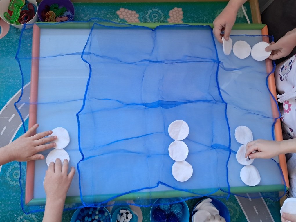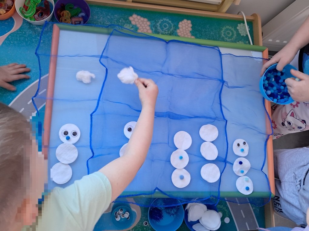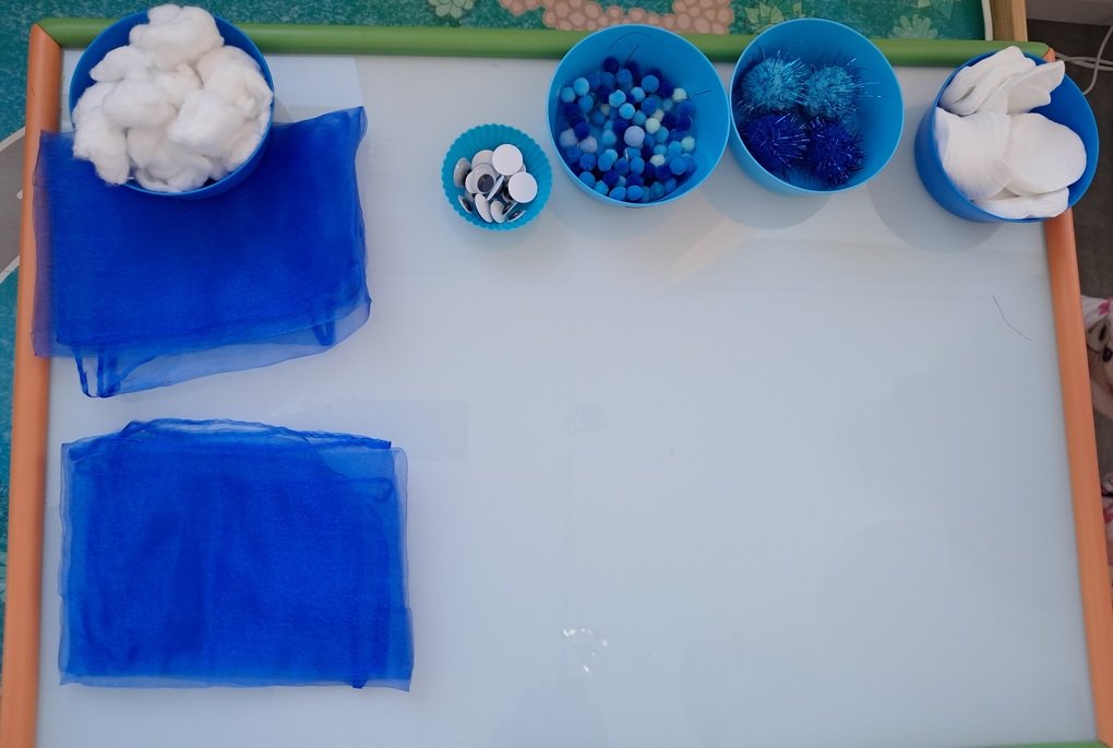 – ant šviesos stalo, naudodami mėlynos spalvos skareles, įvairaus dydžio minkštus mėlynus kamuoliukus, baltos vatos apskritimus, vaikučių iš vatos pagamintus kamuoliukus, kūrė bendrą kūrybinį darbą „Mėlynas žiemos paveikslas“.