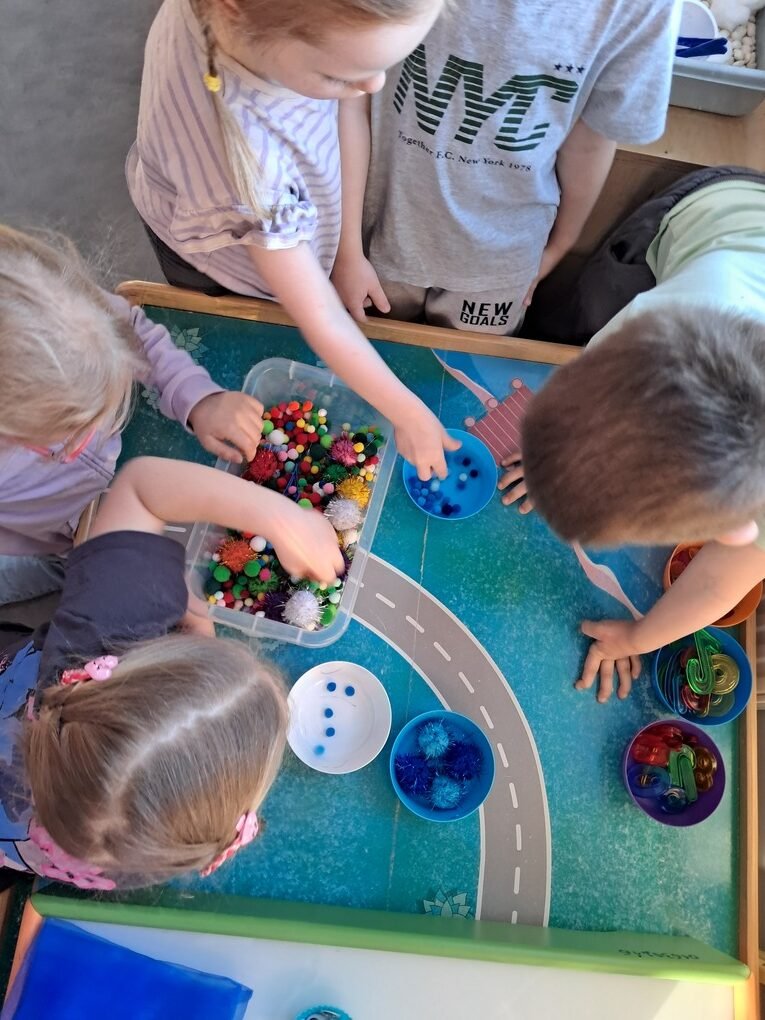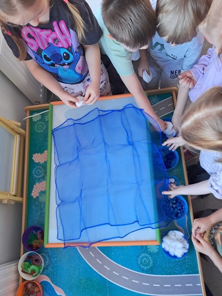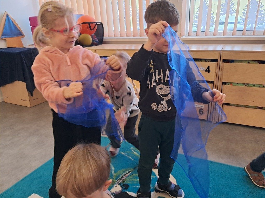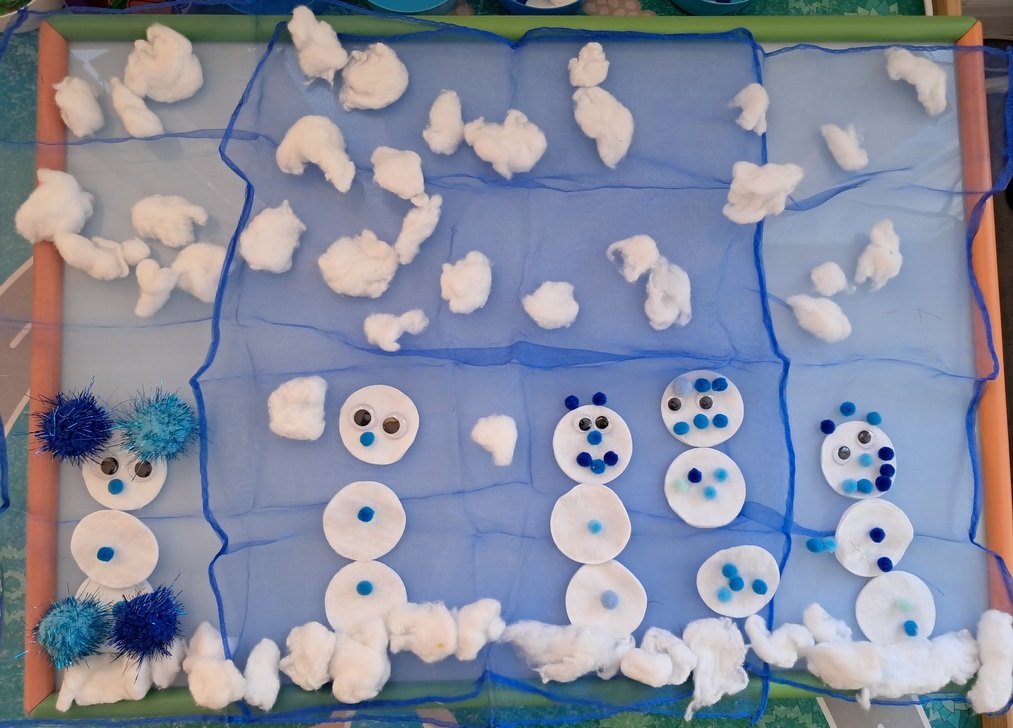 – ant šviesos stalo, naudodami mėlynos spalvos skareles, įvairaus dydžio minkštus mėlynus kamuoliukus, baltos vatos apskritimus, vaikučių iš vatos pagamintus kamuoliukus, kūrė bendrą kūrybinį darbą „Mėlynas žiemos paveikslas“.